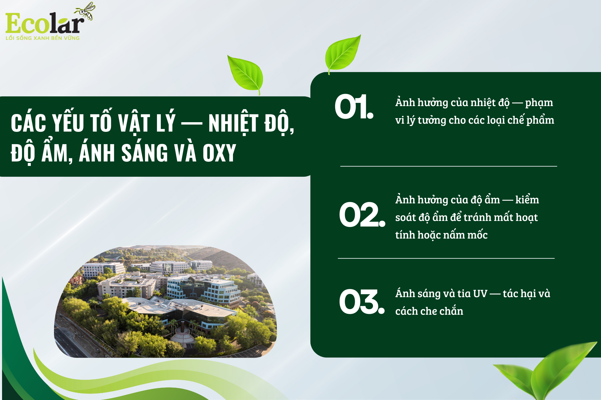 Các yếu tố vật lý — nhiệt độ, độ ẩm, ánh sáng và oxy ảnh hưởng đến bảo quản phân vi sinh