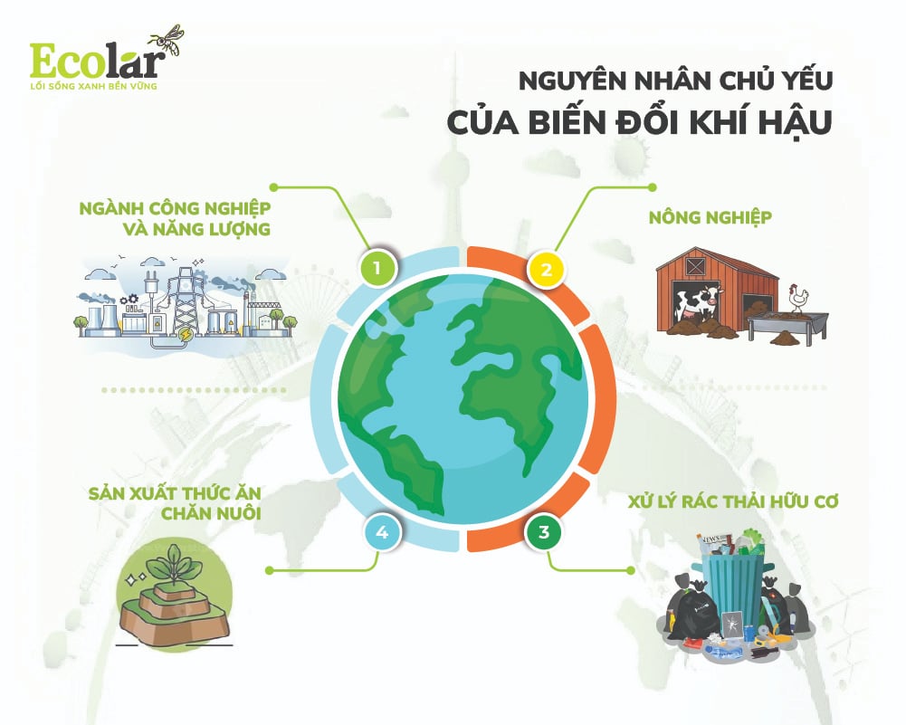 Nguyên nhân chủ yếu của biến đổi khí hậu là sự gia tăng khí nhà kính, xuất phát từ nhiều hoạt động sản xuất và sinh hoạt: