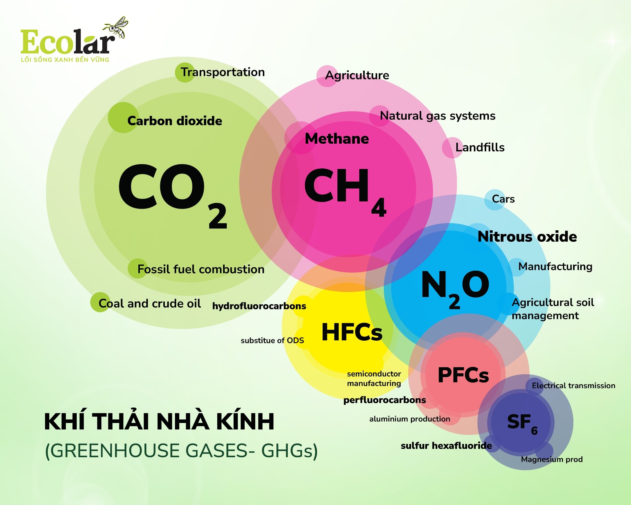 - Carbon dioxide (CO₂): chiếm tỉ trọng lớn nhất, phát thải chủ yếu từ việc đốt nhiên liệu hóa thạch, sản xuất xi măng, công nghiệp, phá rừng.