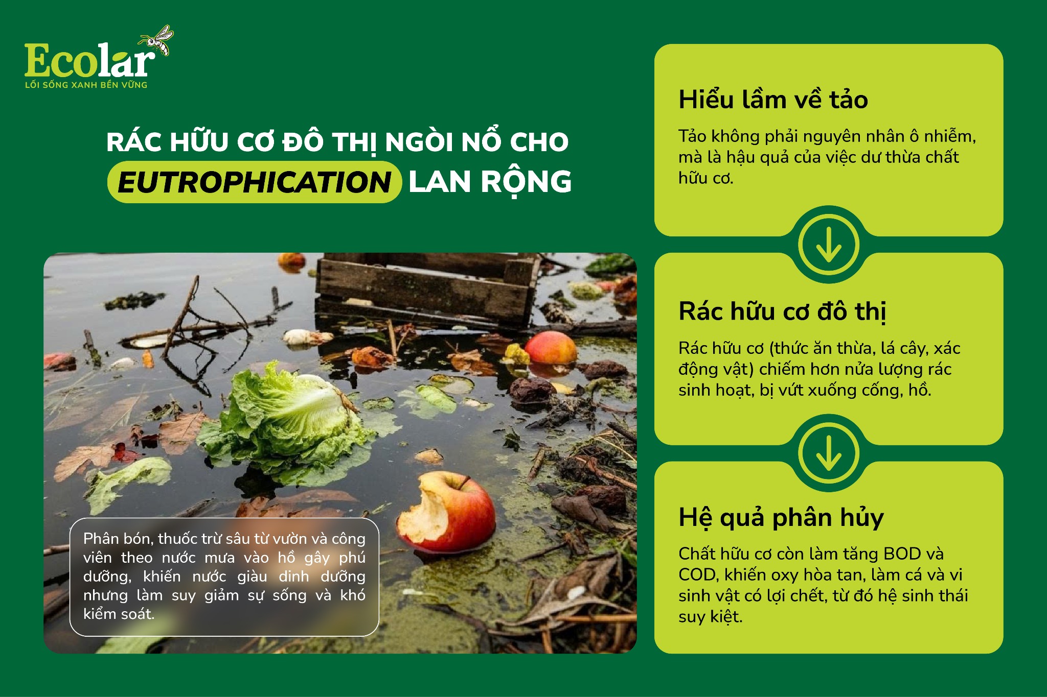 Tại các thành phố lớn, rác hữu cơ chiếm hơn một nửa tổng lượng rác thải sinh hoạt, bao gồm thực phẩm thừa, lá cây, xác động vật… Khi không được thu gom và xử lý đúng cách, phần lớn rác này bị vứt xuống cống rãnh, ao hồ, hoặc phân hủy trực tiếp trong dòng nước mưa. Trong quá trình phân hủy, chúng giải phóng một lượng lớn hợp chất nitơ (N) và photpho (P) – hai yếu tố nuôi sống tảo và vi sinh vật có hại.