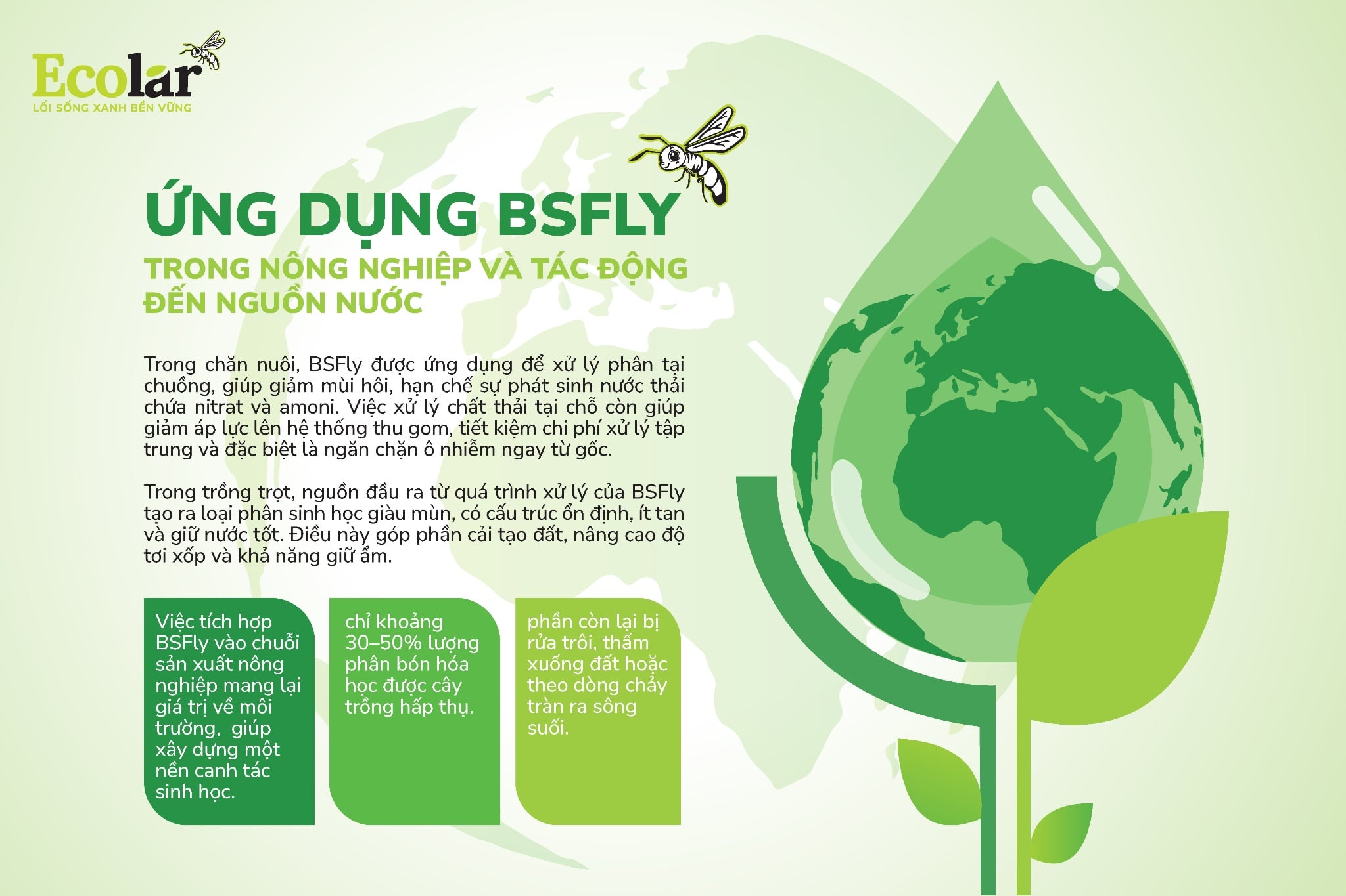 Vì vậy, việc tích hợp BSFly vào chuỗi sản xuất nông nghiệp không chỉ mang lại giá trị về môi trường, mà còn giúp xây dựng một nền canh tác sinh học – nơi chất thải được tái sinh thành tài nguyên, đất được bảo vệ, và nước – nguồn sống căn bản – được giữ gìn bền vững hơn qua từng mùa vụ.