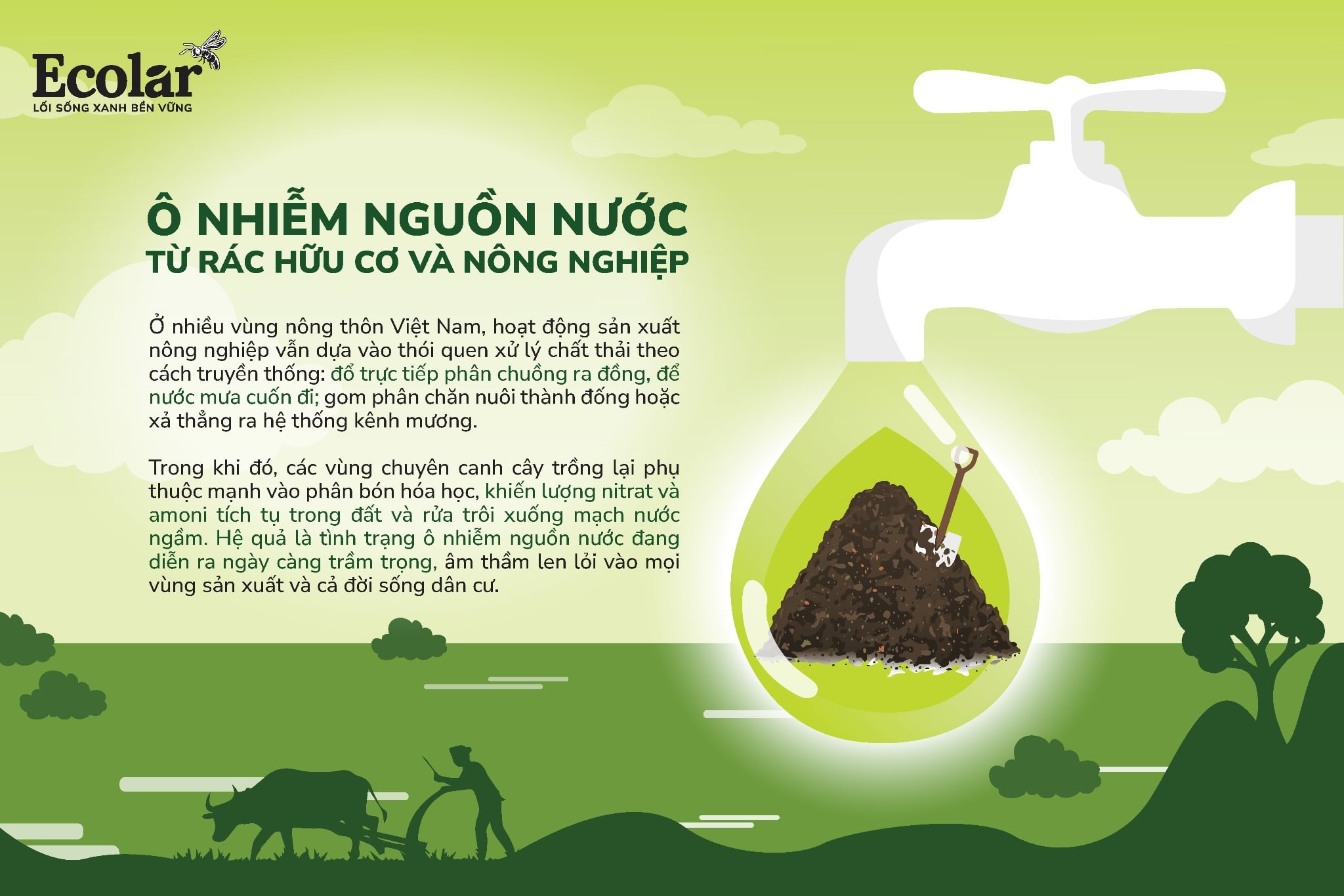 Khi dòng nước bị biến thành dòng chảy ô nhiễm, sự sống bị đẩy lùi, và lòng tin vào sự bền vững của đất đai – nông nghiệp – môi trường cũng dần cạn kiệt. Vì thế, muốn giữ nước sạch, không thể chỉ xử lý ở cuối nguồn, mà cần thay đổi từ gốc: cách chúng ta xử lý rác hữu cơ, phân bón, và tư duy tiếp cận với sản xuất nông nghiệp.