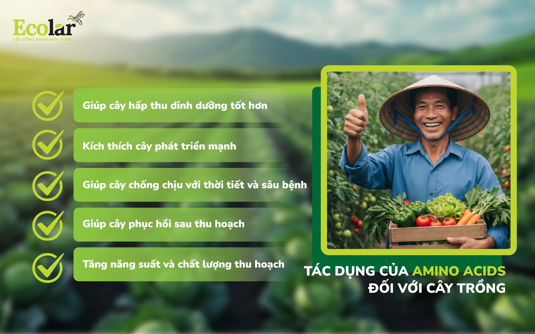 Hiểu được tầm quan trọng của phân bón lá amino acid đối với sự phát triển của cây trồng, Ecolar luôn nỗ lực mang đến cho khách hàng những thông tin hữu ích, dễ hiểu cùng các dòng phân bón amino acid chất lượng cao, được tin dùng rộng rãi trên thị trường hiện nay.