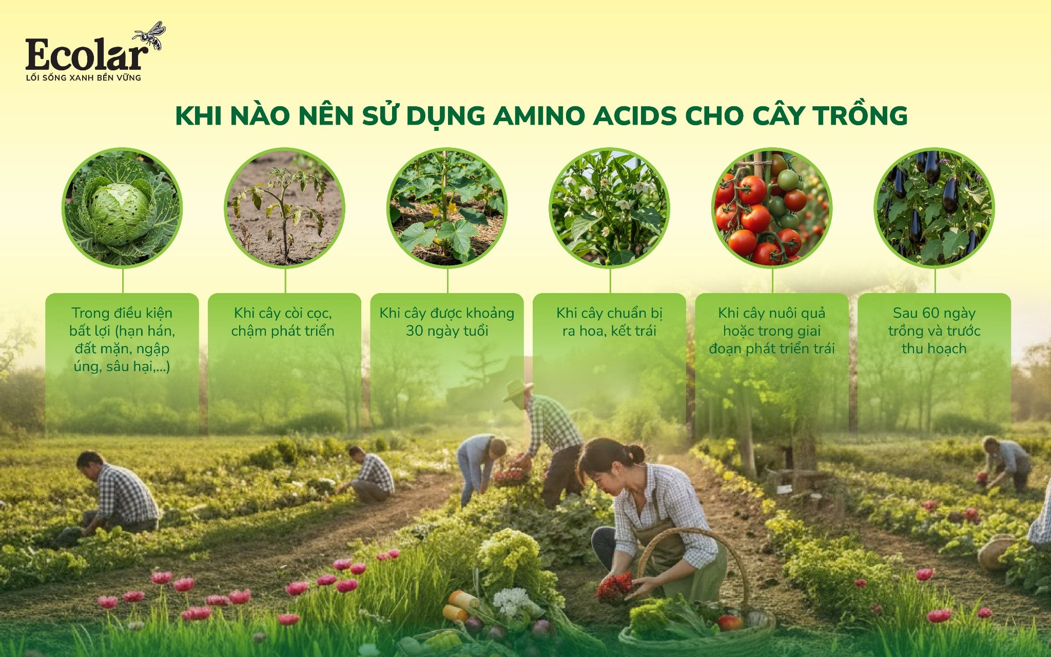 Việc bổ sung chế phẩm amino acid là rất cần thiết trong quá trình canh tác. Người trồng nên sử dụng vào các thời điểm sau để đạt hiệu quả cao nhất: