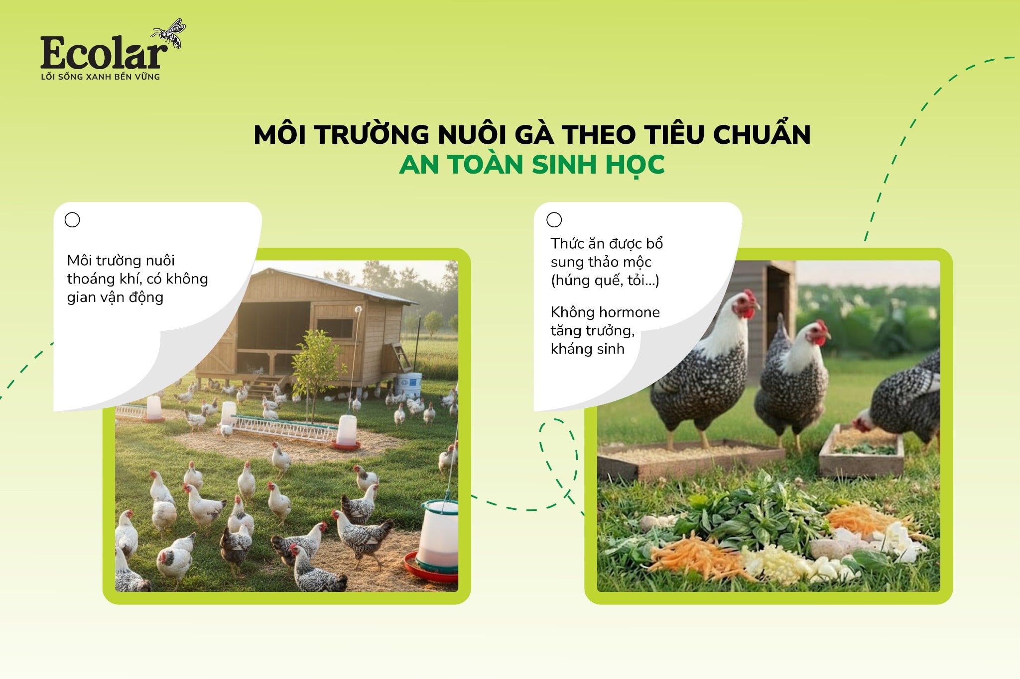 Gà được nuôi trong khu vực thoáng khí, có không gian vận động tự do, nền chuồng được xử lý bằng chế phẩm sinh học, hạn chế mùi và ruồi muỗi, giúp giảm căng thẳng và tăng sức đề kháng tự nhiên. Toàn bộ hệ thống chuồng trại được trang bị công nghệ xử lý chất thải và nước uống tuần hoàn xanh, nhằm hạn chế ô nhiễm và bảo vệ môi trường xung quanh. Điều này không chỉ đảm bảo phúc lợi động vật mà còn giúp chất lượng trứng sạch, tươi, thơm tự nhiên hơn so với mô hình công nghiệp khép kín.