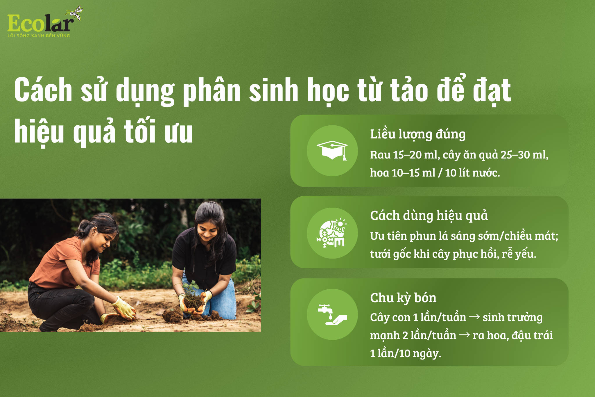 Đây cũng là cách sử dụng phân sinh học từ tảo được nhiều nhà vườn áp dụng để tránh lãng phí mà vẫn đạt năng suất cao. Khi dùng đúng chu kỳ, cây vừa khỏe, vừa cho sản lượng ổn định, nhìn rất “đã mắt”.
