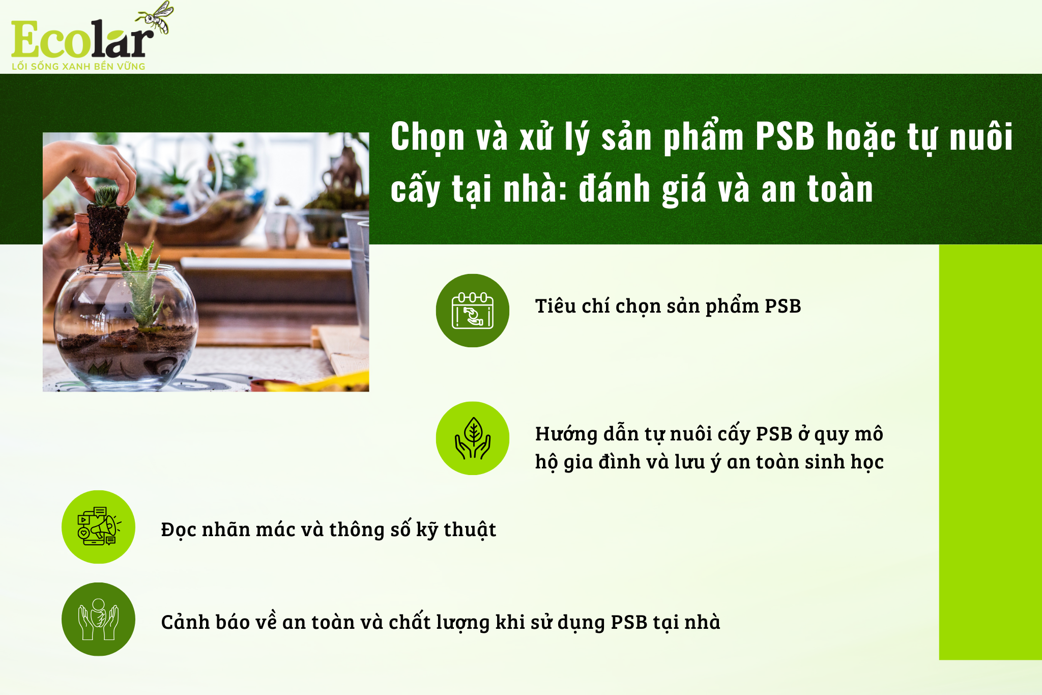 Nếu bạn cân nhắc tự nuôi cấy PSB tại nhà, hãy cân nhắc kỹ về an toàn sinh học. Theo kinh nghiệm thực tế, tốt nhất là không tiến hành khi không có khu vực riêng, thiết bị phù hợp và quy trình chuẩn. Chúng ta thường nghe câu chuyện “tự nuôi cho sướng”, nhưng rủi ro ô nhiễm và lây lan sang thành phẩm rau là có thật.