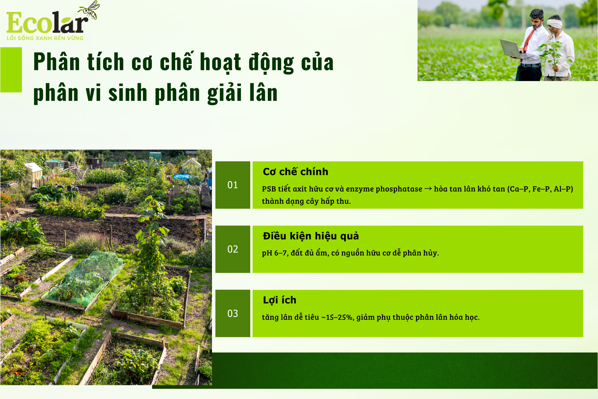 Trang trại nhỏ (1–5 ha): xây dựng lịch tưới và bón có tích hợp PSB, kết hợp với phân hữu cơ ủ kỹ, theo dõi điểm đo hiệu quả (availability) mỗi 6–8 tuần, và thực hiện soil test chi tiết 2–3 lần/năm.