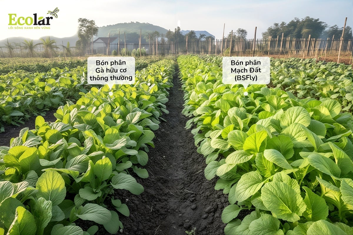 - Luống bón phân Mạch Đất (Ruồi lính đen): Cây phát triển mạnh, lá xanh đậm hơn, tán rộng, thân chắc.
